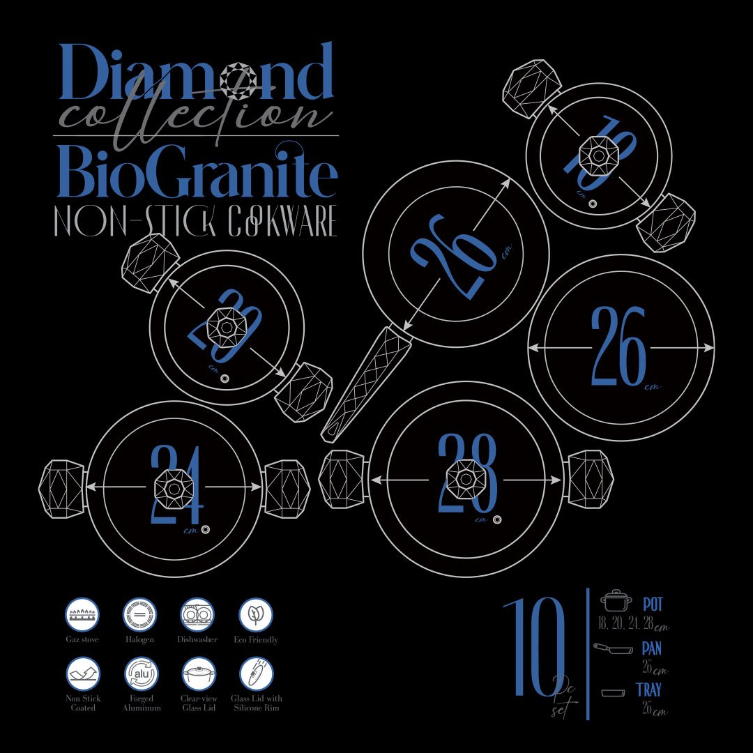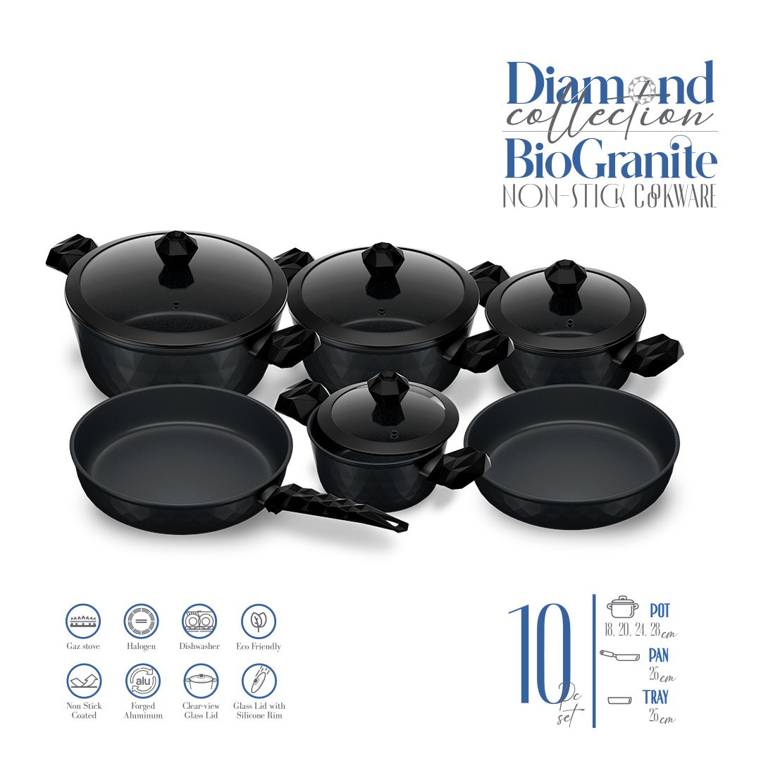 10 Pieces Set Bio Granite Diamond Stone Cookin Aboud ( 18-20-24-28 ) + Fry Pan 26 cm + Oven Tray 26 CM Black