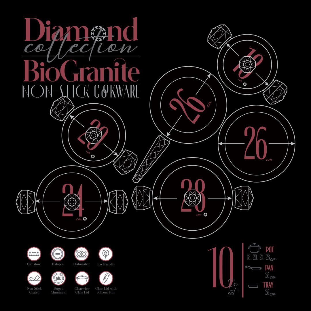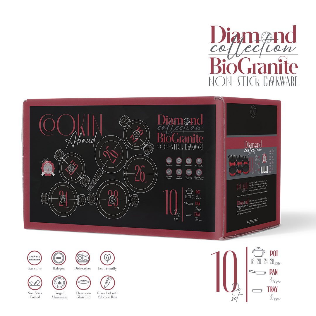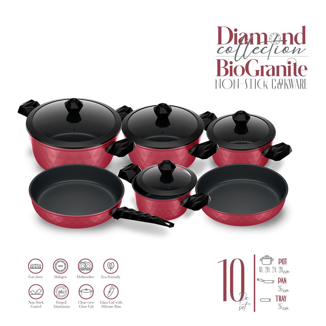 10 Pieces Set Bio Granite Diamond Stone Cookin Aboud ( 18-20-24-28 ) + Fry Pan 26 cm + Oven Tray 26 CM- Red